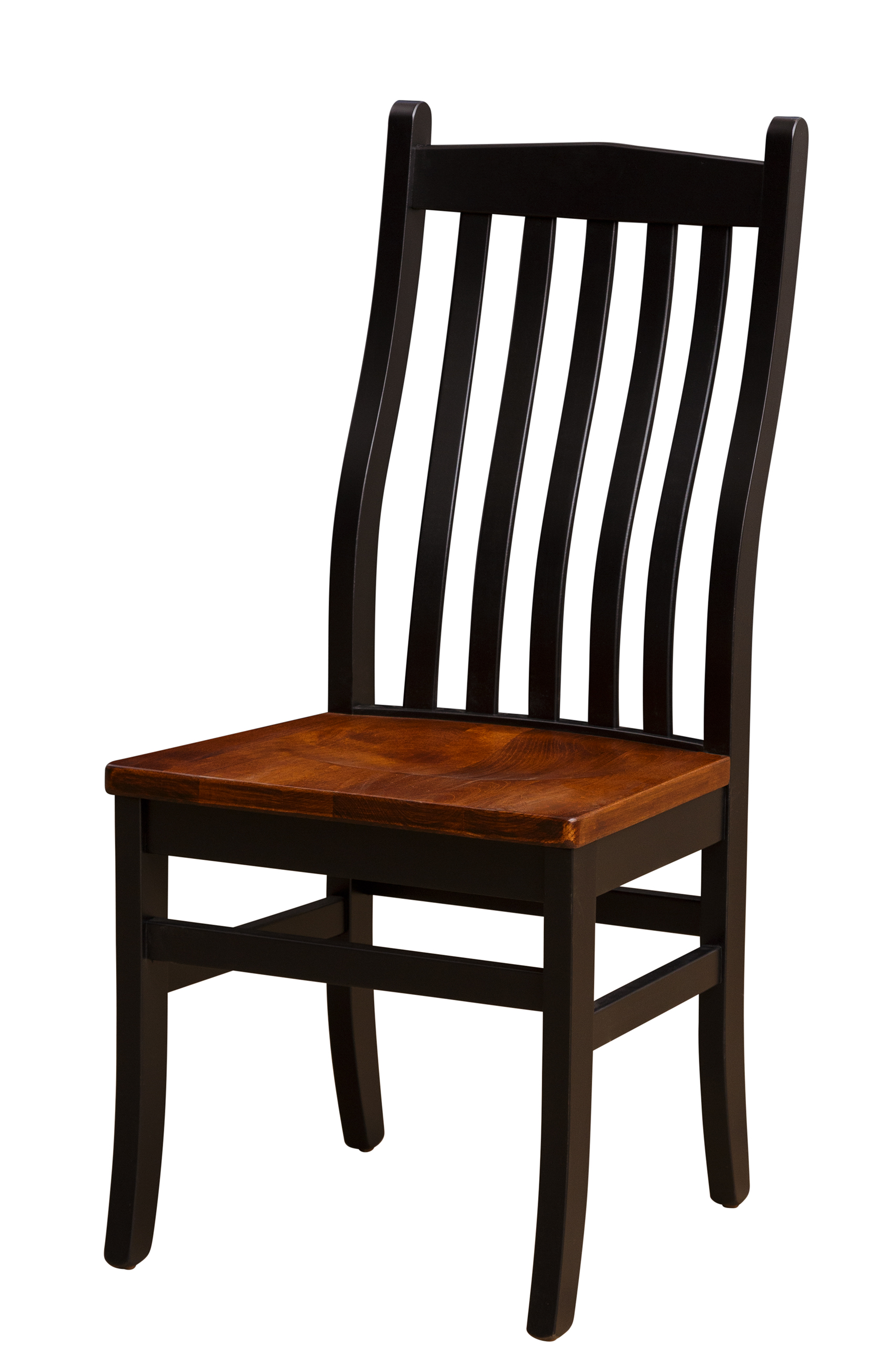 This stately mission-style side chair has a high back and thin slats. It is strong and sturdy, lasting for generations. Customize the wood species, finish, and seat to your preference and style.