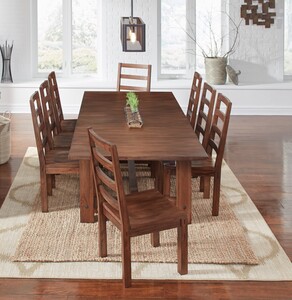 This Modern Rustic dining group is crafted from solid mahogany wood. This hardwood is a perfect choice for the vintage industrial style, due to its durability and exotic looks. The multi-tone finish features a lighter ginger-colored patina that resembles reclaimed wood, originally in demand for loft living spaces and then crossing over into the fashion-focused mainstream. The finish is wire-brushed with a soft hand to enhance the look and impart an aged character quality.