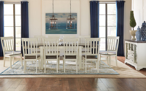 The Mariposa collection is all about function. Tables that can be used for small dining spaces can also be expanded to accommodate as many as twelve. The tables come with two to three 18″ butterfly leaves. It is a perfect style for today’s customer who prefers solid wood and appreciates a beautiful transitional contemporary look. It has a chalk finish with cream undertones.