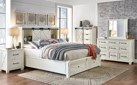 Our Sun Valley Collection evokes the rustic style of early America. Stylish x-framed sliding doors are accented with industrial handles while a distressed white finish highlights the natural character of solid New Zealand pine. Each sturdy case piece provides ample storage and plenty of features.
