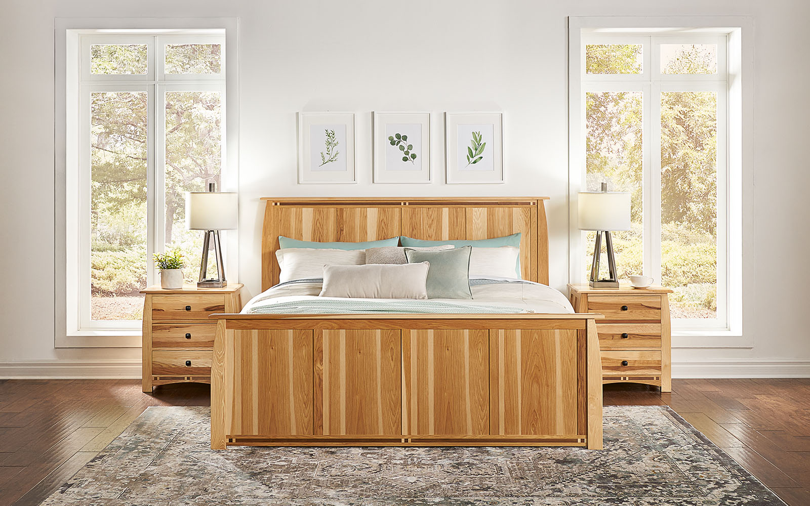 Adamstown is true heirloom furniture with all the bells and whistles for those who appreciate American Arts & Crafts. Constructed out of North American Hickory with quarter inch solid black walnut inlays, this beautifully hand-crafted bedroom features steam-bent sides. The natural beauty of the Hickory wood grain color variation complements this elegant silhouette. Hickory is a high density wood that is extremely resilient to surface damages and is as smooth as glass. Some of the features include heavy duty metal ball bearing drawer glides, English dovetailed drawer boxes, cedar lined drawer bottoms, hidden compartments for valuables, and options for under bed storage.