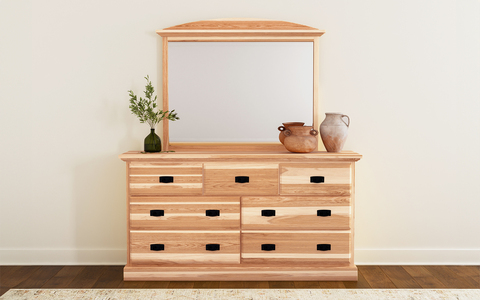 Beautiful modern Arts & Crafts fret work that transitions well into any home. The unique & natural solid Hickory wood grain shines through with mineral streaks, brown cathedral points and rich reddish brown grain patterns. Hickory is a high density wood that is extremely resilient to surface damages and is as smooth as glass with our Catalyzed Lacquer finish. This furniture is guaranteed to become tomorrow’s heirloom.
