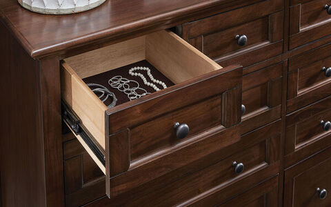 Westlake is modern in design with American Shaker influence. This transitional bedroom collection is made out of sustainable Solid Mahogany and is designed especially for those with more compact bedrooms or simply those who have the need for more storage space. Case pieces feature felt lined top drawers, full extension drawer glides, and English dovetailed drawer boxes front & back. Finished in a glowing cherry brown with dark gun-metal color hardware, this clean line solid Mahogany bedroom group is a great value for any home.