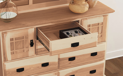 Beautiful modern Arts & Crafts fret work that transitions well into any home. The unique & natural solid Hickory wood grain shines through with mineral streaks, brown cathedral points and rich reddish brown grain patterns. Hickory is a high density wood that is extremely resilient to surface damages and is as smooth as glass with our Catalyzed Lacquer finish. This furniture is guaranteed to become tomorrow’s heirloom.