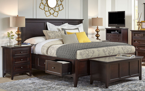 Westlake is modern in design with American Shaker influence. This transitional bedroom collection is made out of sustainable Solid Mahogany and is designed especially for those with more compact bedrooms or simply those who have the need for more storage space. Case pieces feature felt lined top drawers, full extension drawer glides, and English dovetailed drawer boxes front & back. Finished in a new dark mahogany finish, this clean line solid Mahogany bedroom group is a great value for any home.
