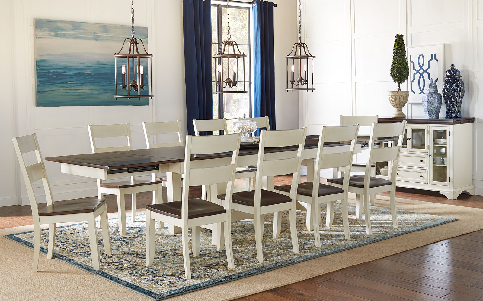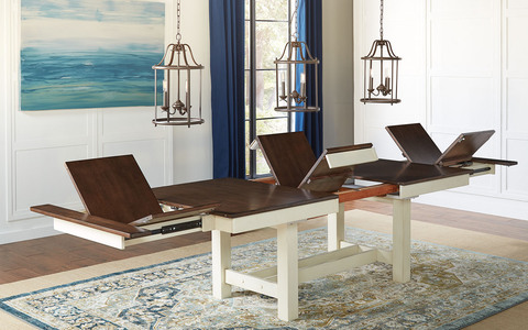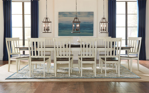 The Mariposa collection is all about function. Tables that can be used for small dining spaces can also be expanded to accommodate as many as twelve. The tables come with two to three 18″ butterfly leaves. It is a perfect style for today’s customer who prefers solid wood and appreciates a beautiful transitional contemporary look. It has a chalk finish with cream undertones.